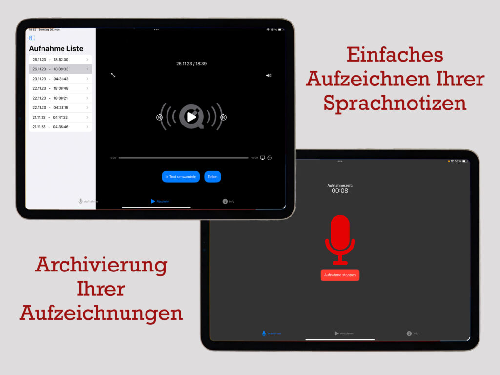 • Archiviere deine Aufnahmen direkt in der App für den schnellen Zugriff.